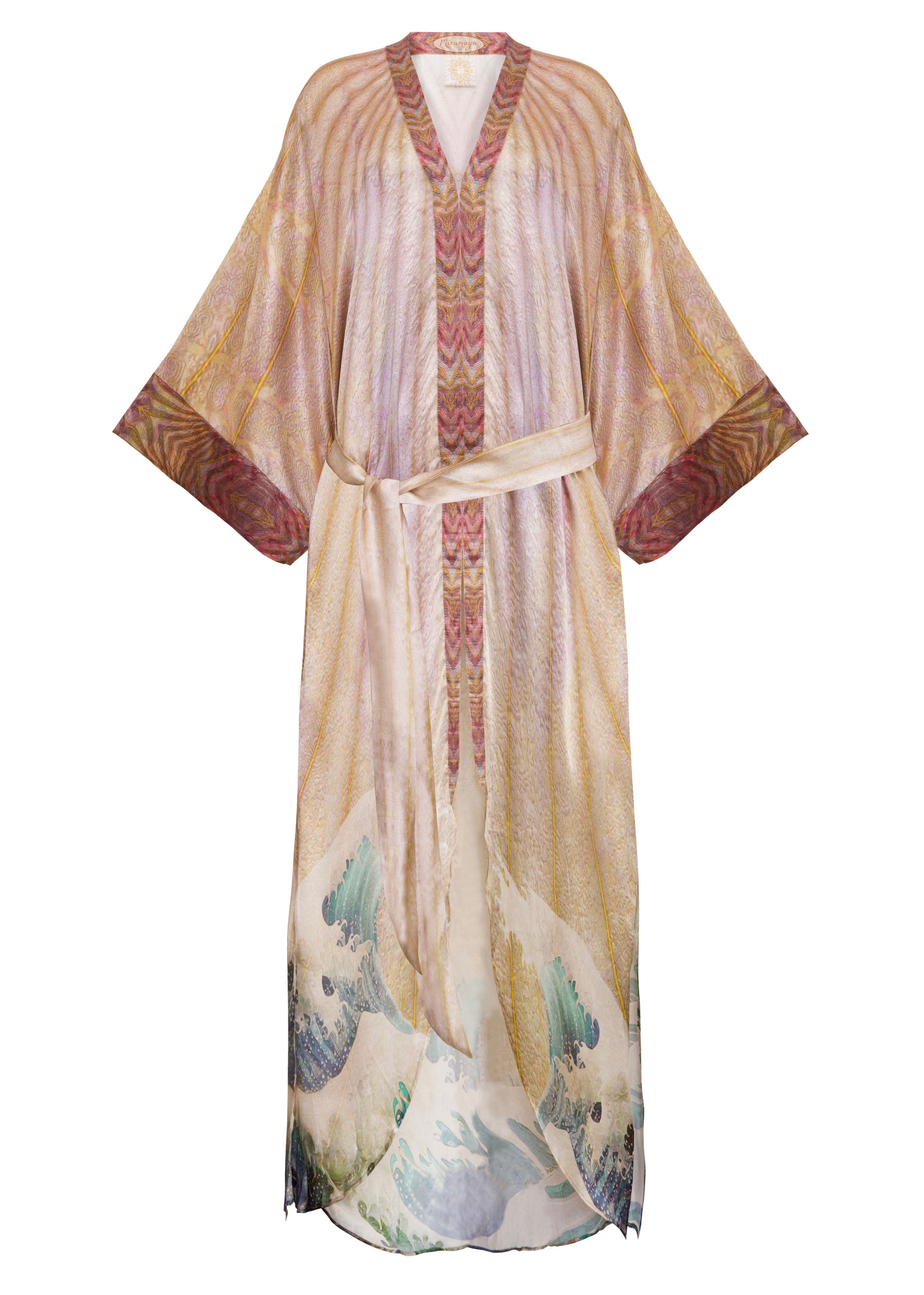 Featuring enchanting rainbow hues with an ocean print at the base, the Kwan Yin Luxury Silk Robe is a portal of magic, a reminder of your inherent holiness and boundless potential.